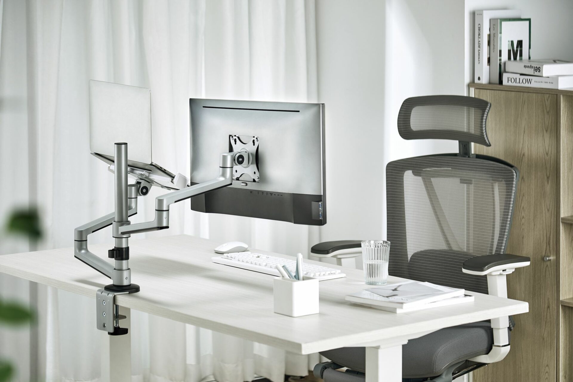 In–arm cable clip routes cables for a clean appearance