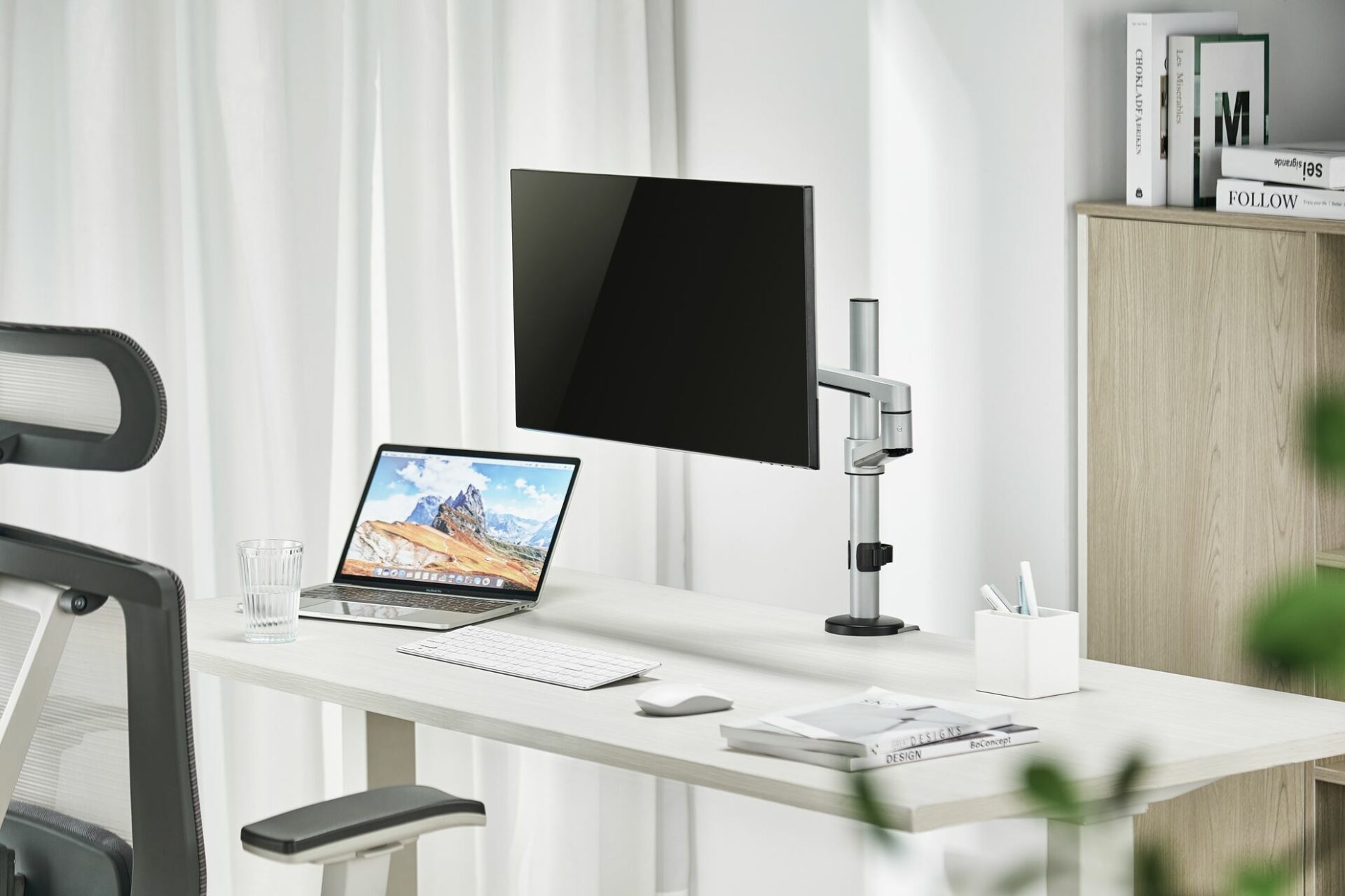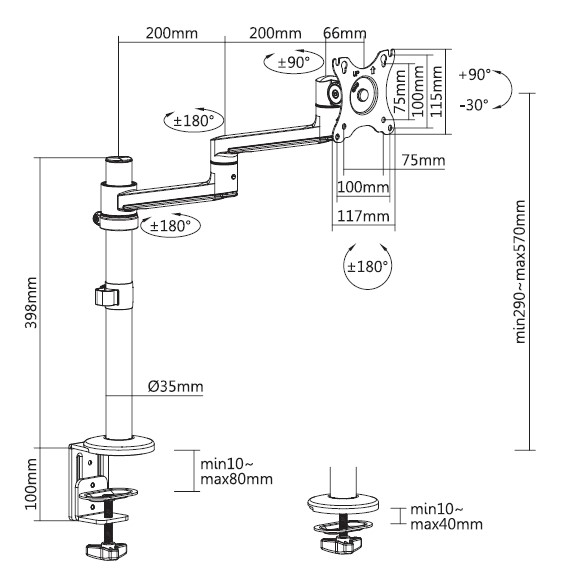 Both desk clamp (for desk thickness 10mm-80mm) and grommet mounting (for desk thickness 10mm-40mm)